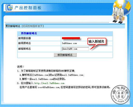 2、在邮箱新域名处输入要更换的新域名,如下图所示