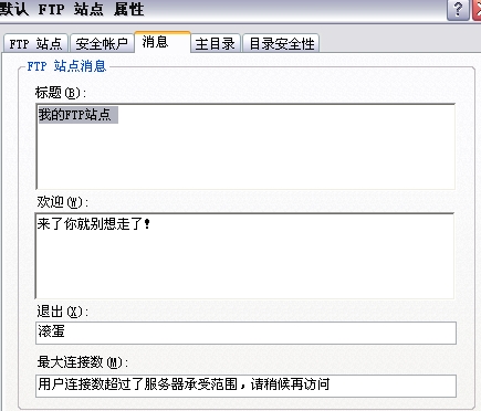最大连接数-----显示连接数量超过服务器设置的最大值时(在FTP站点选项卡下设置),显示的信息。